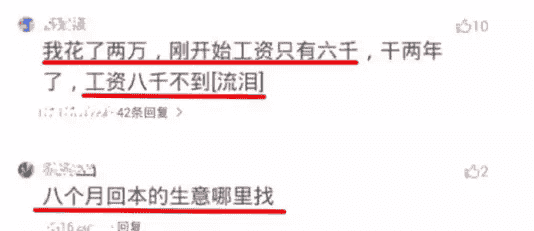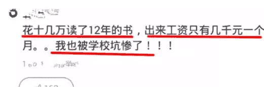 网友一:从上学开始,一下到大学毕业,十几年花了那么多钱读书。到头来,只找到了一个月入几千元的工作,我说什么了吗?