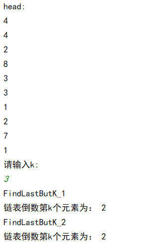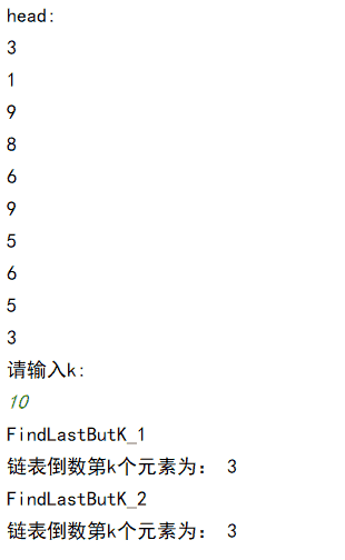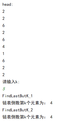 if __name__ == '__main__': head=creatLink(10) print("head:") cur = head.next while cur != None: print(cur.data) cur = cur.next k=int(input("请输入k:\n")) item1=FindLastButK_1(head,k) item2=FindLastButK_2(head,k) print("FindLastButK_1\n链表倒数第k个元素为:",item1) print("FindLastButK_2\n链表倒数第k个元素为:",item2)