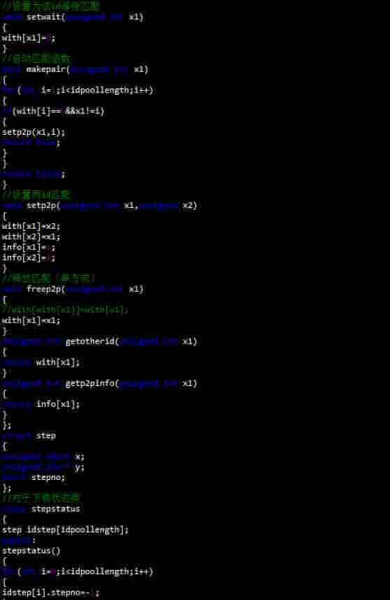 p2p类:它的作用是用来匹配玩家的。当有用户端申请进行游戏时,服务器会先调用makepair函数来寻觅可以进行匹配的另一个玩家,假如找到了合适的玩家,接下来就会调用setp2p简历这两个玩家有对局关系。假如没有匹配到,则会调用setwait等待其余的客户进行匹配。该类使用的数据结构为简单的hash映射。