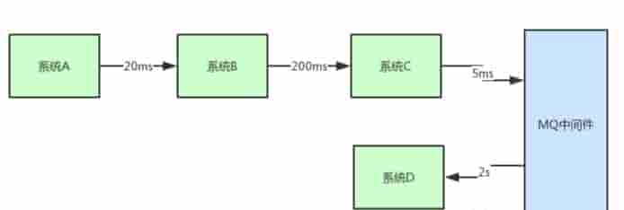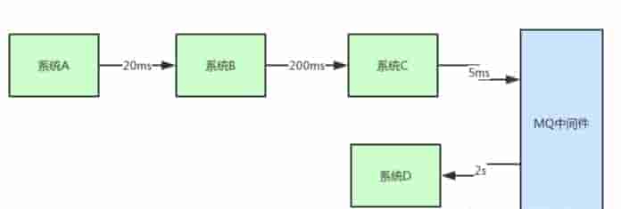 比方说一个核心链路里面,系统A -> 系统B -> 系统C,而后系统C是通过MQ异步调用系统D的。