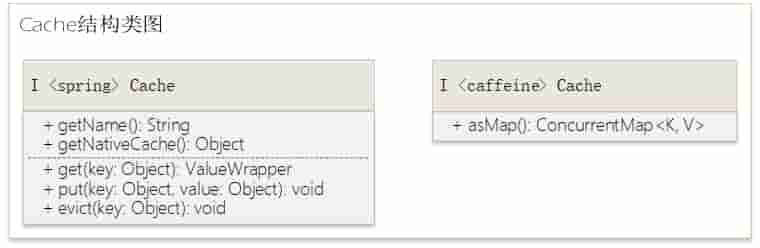 上图简单绘制了Spring中定义的Cache接口和caffeine中定义的Cache接口。