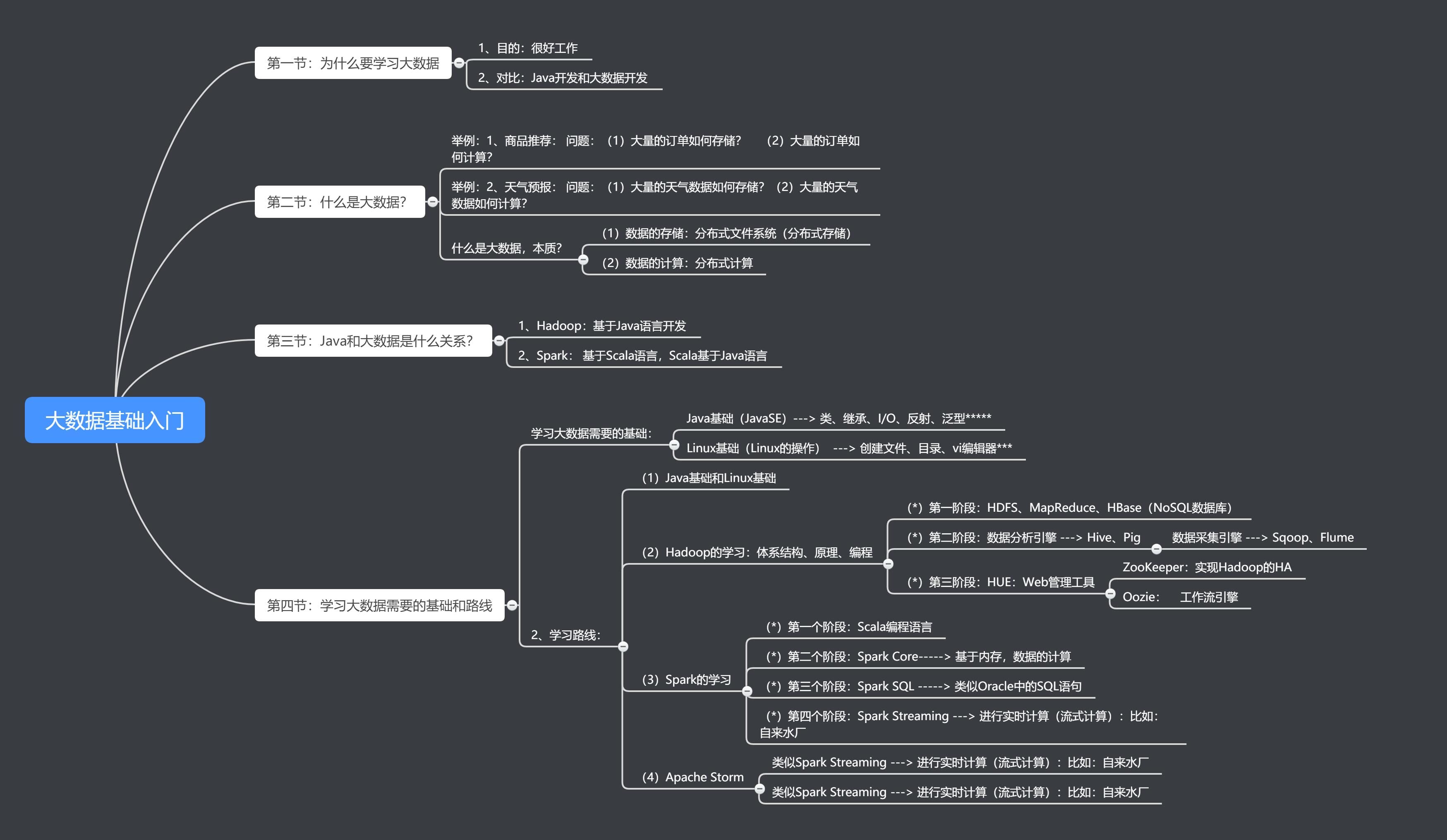 「大数据」制定了一条专业的学习路径,希望帮助大家少走弯路。主要分为 7 个阶段:入门知识 → Java 基础 → Scala 基础 → Hadoop 技术模块 → Hadoop 项目实战 → Spark 技术模块 → 大数据项目实战。其中,阶段一到阶段五均为免费课程,具体说来:阶段一:学习入门知识这一部分主要针对的是新手,在学习之前需要先掌握基本的数据库知识。MySQL 是一个 DBMS(数据库管理系统),是最流行的关系型数据库管理系统(关系数据库,是建立在关系数据库模型基础上的数据库,借助于集合代数等概念和方法来处理数据库中的数据)。MongoDB 是 IT 行业非常流行的一种非关系型数据库(NoSQL),其灵活的数据存储方式备受当前 IT 从业人员的青睐。而 Redis 是一个开源、支持网络、基于内存、键值对存储数据库。两者都非常有必要了解。