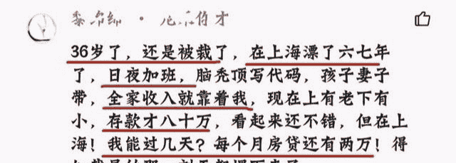 这名程序员位于上海某互联网公司的技术研发部,在这家公司已经工作了六年有余,但是自己已经36岁了,前不久刚刚接到了自己被裁员的通知。现在焦虑的不得了。首先自己仅有八十万存款,其次自己还有不小的生活负担,每个月要还2万的房贷车贷,而且毕竟在一线城市,生活费也不低。现在还没有找到下家,因而这几天天天睡不好,而立之年被裁员了,感觉天都塌下来了。