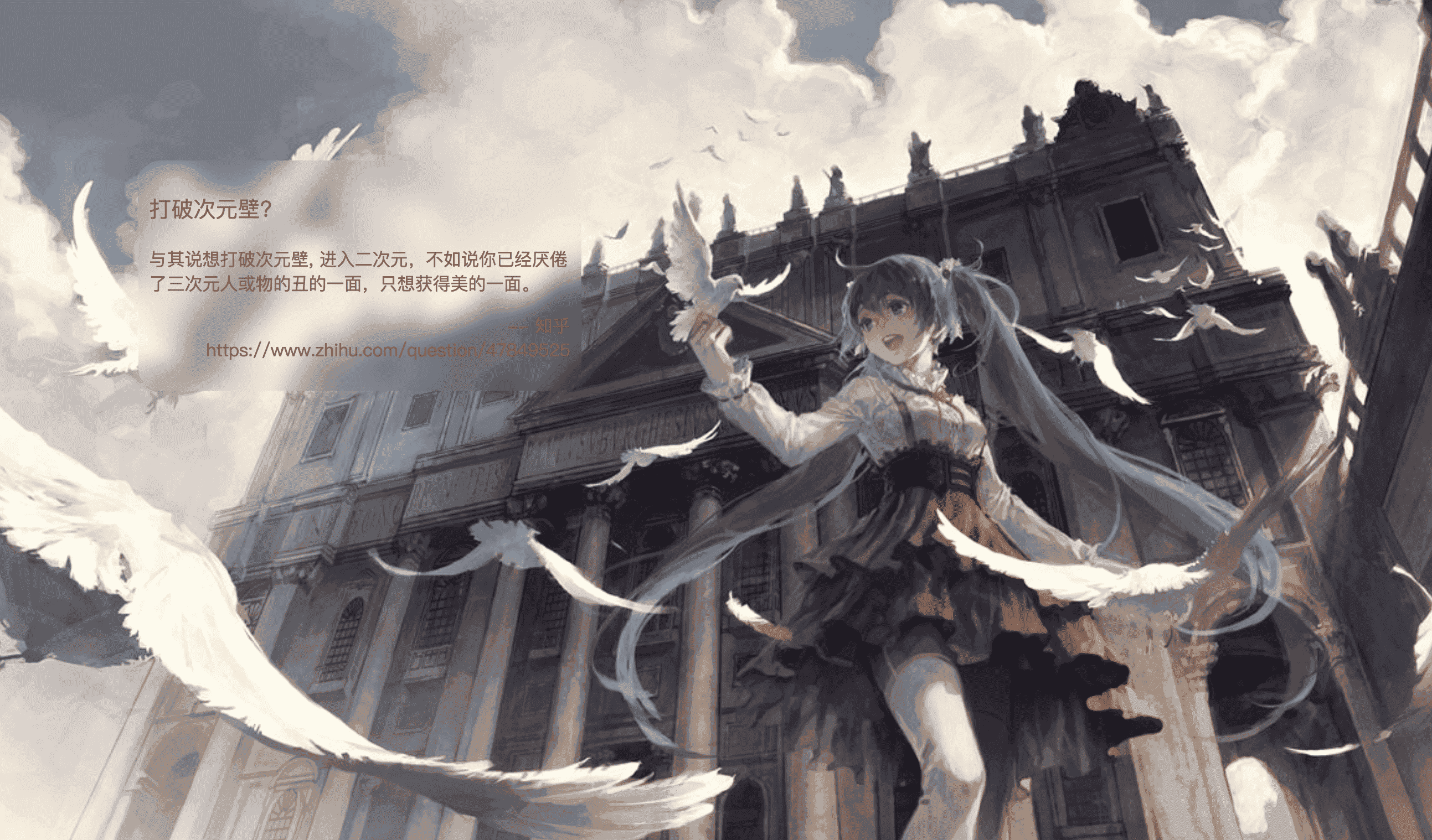 <!DOCTYPE html><html lang="en"><head> <meta charset="UTF-8"> <title>毛玻璃效果</title></head><style> body { margin: 0; } main, .wall::before{ background: url("http://fangyuanxiaozhan.com:10080/zhaoolee/images/raw/master/mk.jpg") 50% / cover no-repeat fixed; } main{ height: 100vh; width: 100%; } .wall { width: 380px; position: absolute; top: 20%; left: 10%; padding: 10px; color: #A84631; border-radius: 20px; overflow: hidden; z-index: 2; } .wall::before { content: ''; position: absolute; top: 0; left: 0; bottom: 0; right: 0; filter: blur(10px); margin: -20px; z-index: -1; } </style><body> <main> <div class="wall"> <p style="font-size: 20px"> 打破次元壁? </p> 与其说想打破次元壁, 进入二次元,不如说你已经厌倦了三次元人或者物的丑的一面,只想取得美的一面。 <p style="text-align: right"> -- 知乎 https://www.zhihu.com/question/47849525 </p> </div> </main></body></html>