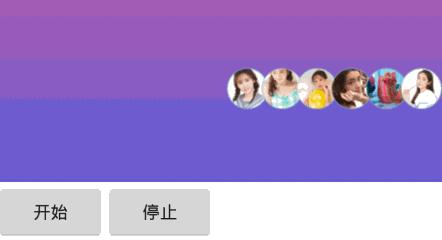 public class AmoyTicketLayout extends FrameLayout { public AmoyTicketLayout(@NonNull Context context) { this(context, null); } public AmoyTicketLayout(@NonNull Context context, @Nullable AttributeSet attrs) { this(context, attrs, 0); } public AmoyTicketLayout(@NonNull Context context, @Nullable AttributeSet attrs, int defStyleAttr) { super(context, attrs, defStyleAttr); initView(context); } private void initView(Context context) { eachWidth = SizeUtils.dp2px(context, 35); eachMargin = SizeUtils.dp2px(context, 7); distance = eachWidth - eachMargin; //先增加0号view initFirstView(); //循环增加其他子View for (int i = 5; i >= 0; i--) { LayoutParams layoutParams = getLayoutParams(i); ImageView roundedImageView = getImageView(); addView(roundedImageView, layoutParams); } } //增加0号view 并缩放到最小 private void initFirstView() { ImageView imageView = getImageView(); imageView.setScaleX(0); imageView.setScaleY(0); addView(imageView, getLayoutParams(5)); } private ImageView getImageView() { ImageView roundedImageView = new ImageView(getContext()); roundedImageView.setScaleType(ImageView.ScaleType.FIT_XY); return roundedImageView; } //每个子View的marginRight距离是相同的 private LayoutParams getLayoutParams(int i) { LayoutParams layoutParams = new LayoutParams(eachWidth,eachWidth); layoutParams.gravity = Gravity.RIGHT | Gravity.CENTER_VERTICAL; int marginRight = (distance) * i; layoutParams.setMargins(0, 0, marginRight, 0); return layoutParams; }}