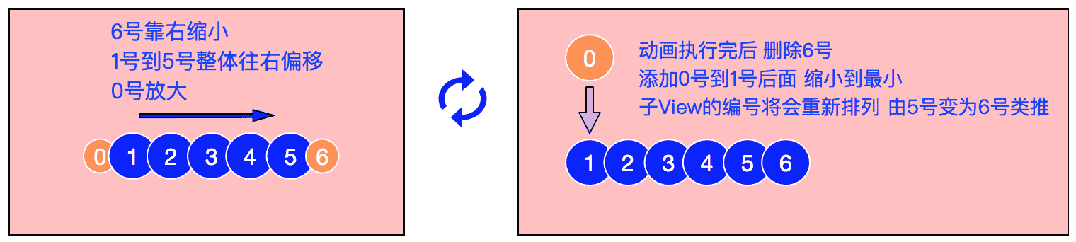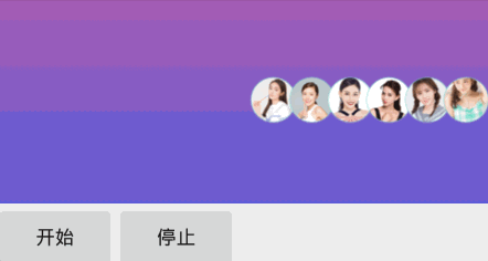 public void startAnimations() { if (!stopAnimator) return; if (null == drawables || drawables.isEmpty()) { stopAnimator = false; return; } ValueAnimator valueAnimator = ValueAnimator.ofFloat(1.0f, 0.0f); valueAnimator.setDuration(1000); valueAnimator.setInterpolator(new LinearInterpolator()); valueAnimator.addUpdateListener(new ValueAnimator.AnimatorUpdateListener() { @Override public void onAnimationUpdate(ValueAnimator animation) { float animatedValue = (float) animation.getAnimatedValue(); int childCount = getChildCount() - 1; float v = 1.0f - animatedValue; //计算每个单元平移的距离 float translationX = distance * (v); for (int i = 0; i < getChildCount(); i++) { ImageView childView = (ImageView) getChildAt(i); if (i == childCount) {//当view为最后一个时 也就是6号 做缩小操作 childView.setScaleX(animatedValue); childView.setScaleY(animatedValue); } else if (i == 0) {//当view为第一个时 也就是0号 做放大操作 childView.setScaleX(v); childView.setScaleY(v); } else {//其余view 就通不断改变marginRight 来做平移动作 FrameLayout.LayoutParams layoutParams = (LayoutParams) childView.getLayoutParams(); int marginRight = (distance) * (childCount - i); layoutParams.setMargins(0, 0, (int) (marginRight - translationX), 0); childView.setLayoutParams(layoutParams); } } } }); valueAnimator.addListener(new AnimatorListenerAdapter() { @Override public void onAnimationStart(Animator animation) { //动画开始确定最后一个View的缩放中心点 int childCount = getChildCount() - 1; ImageView imageView = (ImageView) getChildAt(childCount); imageView.setPivotX(eachWidth); imageView.setPivotY(eachWidth / 2); } @Override public void onAnimationEnd(Animator animation) { int childCount = getChildCount() - 1; //动画结束删除最后一个View 也就是6号 removeViewAt(childCount); //确定获取图片资源的index position++; if (position >= drawables.size()) { position = 0; } ImageView imageView = getImageView(); imageView.setBackground(drawables.get(position)); imageView.setScaleX(0); imageView.setScaleY(0); //动画结束 创立0号View 放到1号后面 其余view的index 将一律加1 addView(imageView, 0, getLayoutParams(5)); //再次启动动画 startAnimation(); } }); valueAnimator.start(); }
