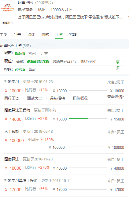 这是我一家招聘网上看到的阿里巴巴招聘工资,排在第一位的是人工智能,其次是图像算法(目前也挺火的),而后才是机械学习。可以看到人工智能的工资远远高于其余岗位,当然这基本上是985/211的毕业生,其余本科的待遇可能会差一点,不过基本保持在15K-20K之间吧,想想互联网其余岗位那个起薪有这么高。