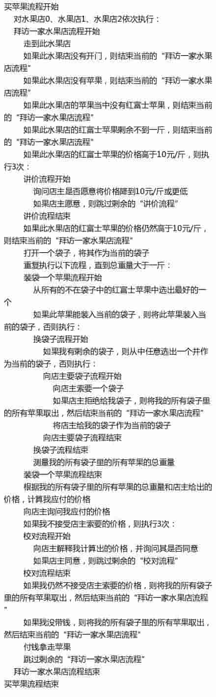 这篇答复并不是讲述在生活中程序员如何买苹果,而是以买苹果为例说明程序员如何处理问题。程序员需要对问题进行透彻的分析,理清其涉及的所有细节,预测可能发生的所有意外与非意外的情况,列出处理方案的所有步骤,以及对处理方案进行尽量全面的测试。而这些正是编程难的地方。任何一点遗漏都会成为bug,轻则导致挨骂,重则导致经济损失甚至危害安全。