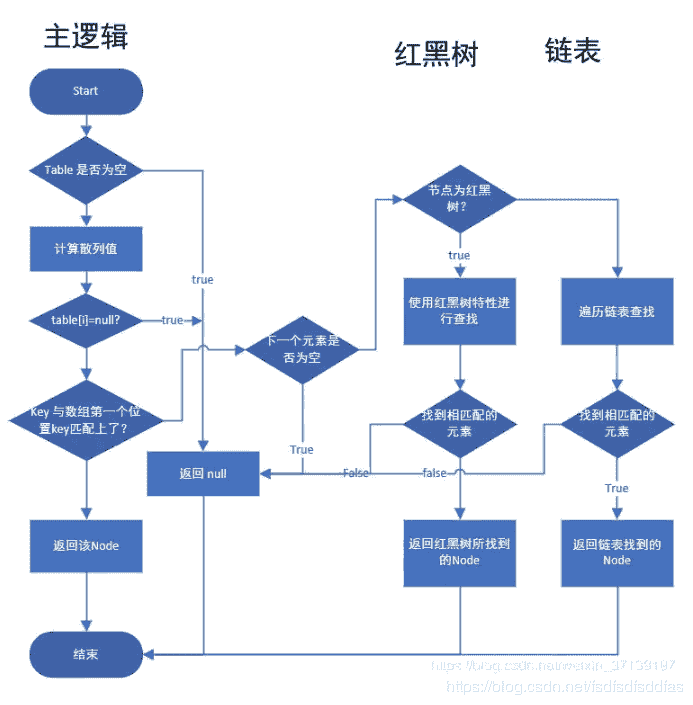 /** * @param hash 指定参数key的哈希值 * @param key 指定参数key * @return 返回node,假如没有则返回null */ final Node<K, V> getNode(int hash, Object key) { Node<K, V>[] tab; Node<K, V> first, e; int n; K k; //假如哈希表不为空,而且key对应的桶上不为空 if ((tab = table) != null && (n = tab.length) > 0 && (first = tab[(n - 1) & hash]) != null) { //假如桶中的第一个节点就和指定参数hash和key匹配上了 if (first.hash == hash && // always check first node ((k = first.key) == key || (key != null && key.equals(k)))) //返回桶中的第一个节点 return first; //假如桶中的第一个节点没有匹配上,而且有后续节点 if ((e = first.next) != null) { //假如当前的桶采用红黑树,则调用红黑树的get方法去获取节点 if (first instanceof TreeNode) return ((TreeNode<K, V>) first).getTreeNode(hash, key); //假如当前的桶不采用红黑树,即桶中节点结构为链式结构 do { //遍历链表,直到key匹配 if (e.hash == hash && ((k = e.key) == key || (key != null && key.equals(k)))) return e; } while ((e = e.next) != null); } } //假如哈希表为空,或者者没有找到节点,返回null return null;}