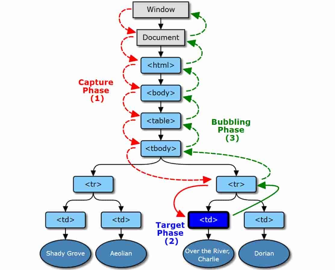 DOM2 级事件流分为三个阶段,事件捕获阶段、目标阶段和事件冒泡阶段。也就是 事件先从 window 对象一级一级传到目标元素,在从目标元素传到 window 对象。就像下图所示: