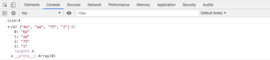 let hashTable = new HashMap(10)hashTable.set('1')hashTable.set('aa')hashTable.set('6a')hashTable.set('75')console.log('size:' + hashTable.size)console.log(hashTable.showAllData())