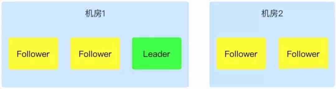 其实,还是不行的。如果“机房 2”故障,“机房 1”正常,这种情况下,由于“机房 1”存在 3 个节点,大于半数,因而还是能够正常工作的;但是,如果“机房 1”故障,那存活节点数只有 2 个,整个集群是不能正常工作的。
