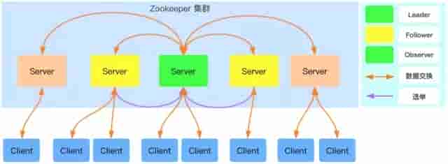 下图是 Zookeeper 的架构图,ZooKeeper 集群中包含 Leader、Follower 以及 Observer 三个角色: