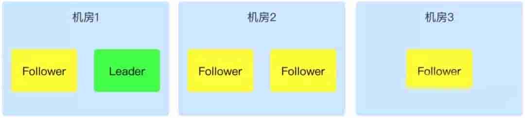 我们再来看看三机房部署,三机房部署,是能够做到机房容灾的。还是以 5 个节点的集群为例: