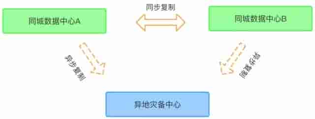 “两地三中心”即生产数据中心、同城灾备中心、异地灾备中心建设方案。这种模式下,两个城市的三个数据中心互联互通,假如一个数据中心发生故障或者灾难,其余数据中心可以正常运行并对关键业务或者一律业务实现接管。