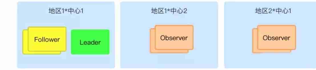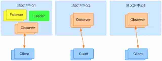 为了保护集群,在三个中心都部署上 Observer 节点,而 Client 只与 Observer 机点进行交互,用这种方式可以降低投票节点的工作负载,降低 Leader 和 Follower 的不稳固性,从而提高整个集群的稳固性和可用性。