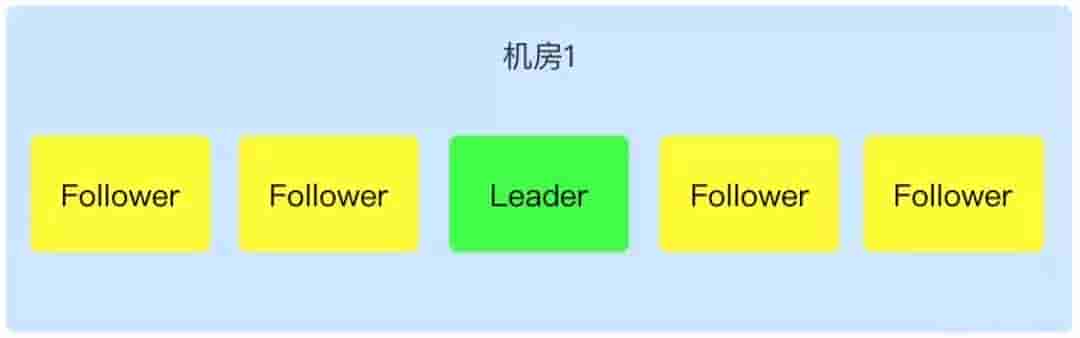我们先看下单机房部署情况下,下图是单个机房 5 个节点的部署情况。在单机房部署的情况下是不能做到机房容灾的,一旦机房出现问题,整个 Zookeeper 集群就不能对外工作。
