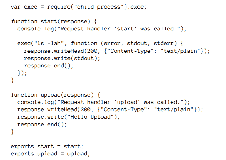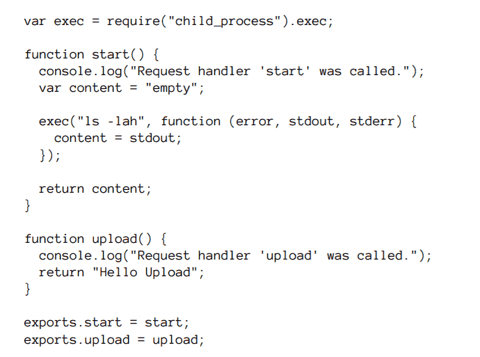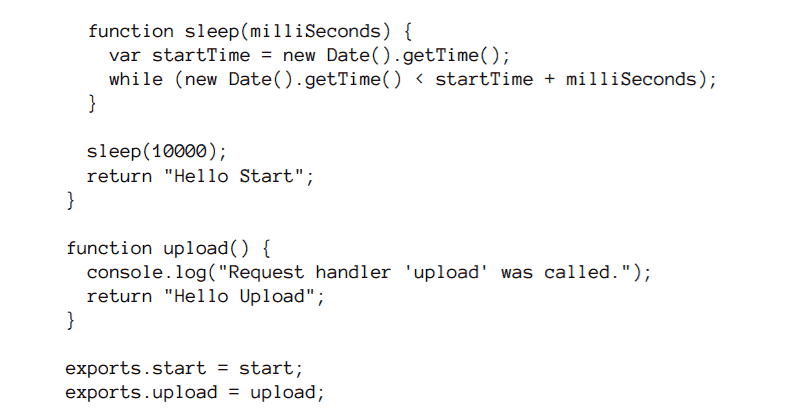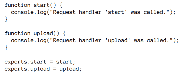 function start(response) {console.log("Request handler 'start' was called.");var body = '<html>'+'<head>'+'<meta http-equiv="Content-Type" content="text/html; '+'charset=UTF-8" />'+'</head>'+'<body>'+'<form action="/upload" method="post">'+'<textarea name="text" rows="20" cols="60"></textarea>'+'<input type="submit" value="Submit text" />'+'</form>'+'</body>'+'</html>';response.writeHead(200, {"Content-Type": "text/html"});response.write(body);response.end();}function upload(response) {console.log("Request handler 'upload' was called.");response.writeHead(200, {"Content-Type": "text/plain"});response.write("Hello Upload");response.end();}exports.start = start;exports.upload = upload;