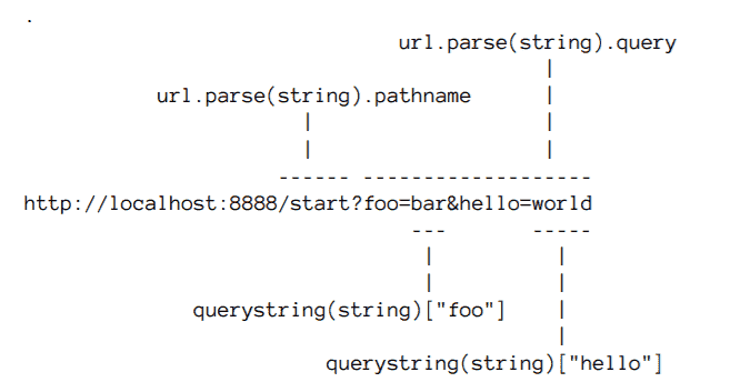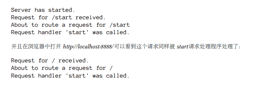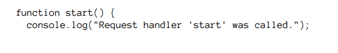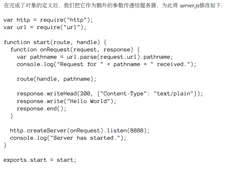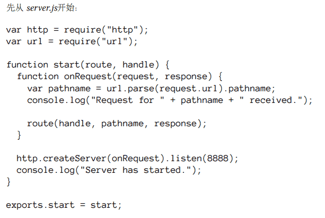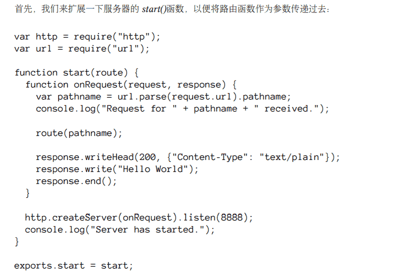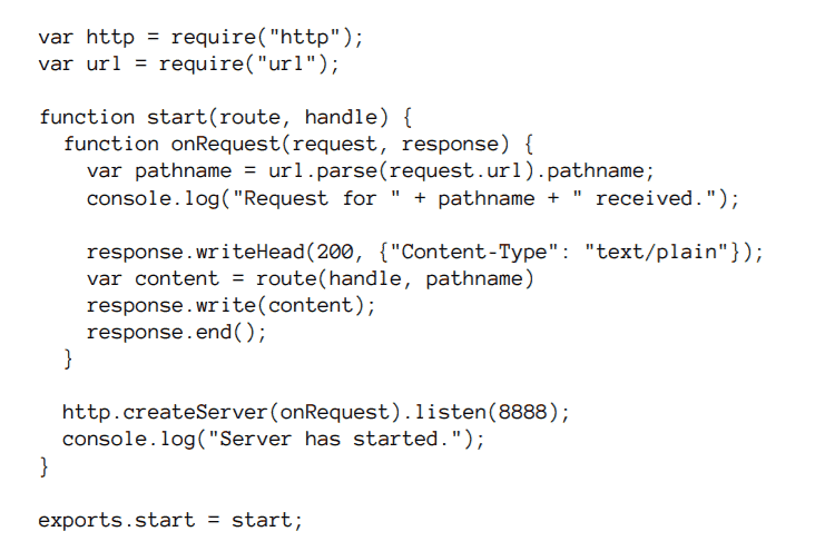var http = require("http");var url = require("url");function start() {function onRequest(request, response) {var pathname = url.parse(request.url).pathname;console.log("Request for " + pathname + " received.");response.writeHead(200, {"Content-Type": "text/plain"});response.write("Hello World");response.end();}http.createServer(onRequest).listen(8888);console.log("Server has started.");}exports.start = start;