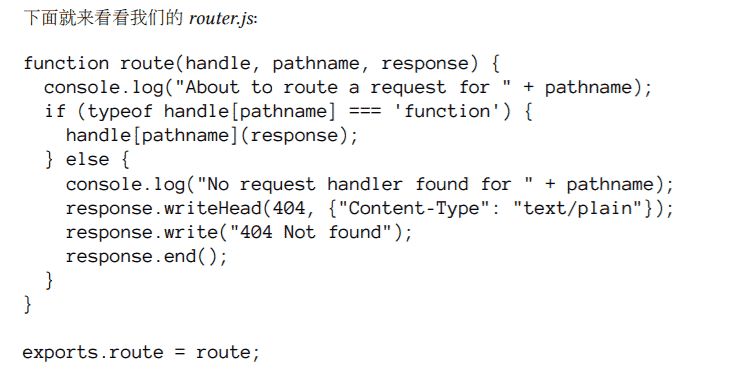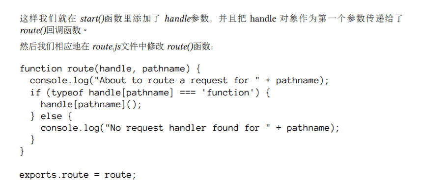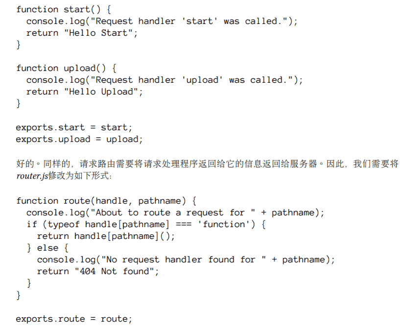 function route(handle, pathname, response, postData) {console.log("About to route a request for " + pathname);if (typeof handle[pathname] === 'function') {handle[pathname](response, postData);} else {console.log("No request handler found for " + pathname);response.writeHead(404, {"Content-Type": "text/plain"});response.write("404 Not found");response.end();}}exports.route = route;