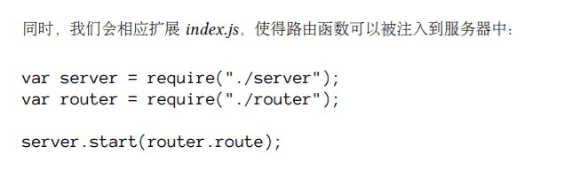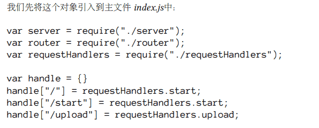 先从 server.js开始:var http = require("http");var url = require("url");function start(route, handle) {function onRequest(request, response) {var postData = "";var pathname = url.parse(request.url).pathname;console.log("Request for " + pathname + " received.");request.setEncoding("utf8");request.addListener("data", function(postDataChunk) {postData += postDataChunk;console.log("Received POST data chunk '"+postDataChunk + "'.");});request.addListener("end", function() {route(handle, pathname, response, postData);});}http.createServer(onRequest).listen(8888);console.log("Server has started.");}exports.start = start;