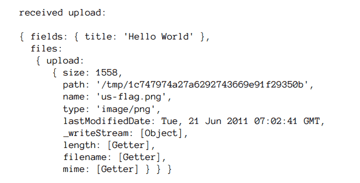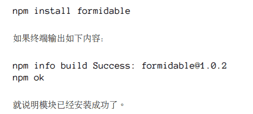 node-formidable 官方的例子展现了这两部分是如何融合在一起工作的:var formidable = require('formidable'),http = require('http'),sys = require('sys');http.createServer(function(req, res) {if (req.url == '/upload' && req.method.toLowerCase() == 'post') {// parse a file uploadvar form = new formidable.IncomingForm();form.parse(req, function(err, fields, files) {res.writeHead(200, {'content-type': 'text/plain'});res.write('received upload:\n\n');res.end(sys.inspect({fields: fields, files: files}));});return;}// show a file upload formres.writeHead(200, {'content-type': 'text/html'});res.end('<form action="/upload" enctype="multipart/form-data" '+'method="post">'+'<input type="text" name="title"><br>'+'<input type="file" name="upload" multiple="multiple"><br>'+'<input type="submit" value="Upload">'+'</form>');}).listen(8888);