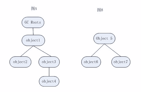 通过少量列的称为“GC Roots”的对象作为起始点,从这些节点开始向下搜索,搜索所走过的路径称为引用链,当一个对象到GC Roots没有任何引用链相连时(就是从GC Roots 到这个对象是不可达),则证实此对象是不可用的。所以它们会被判定为可回收对象(例如图B中的对象既是不可达的)。