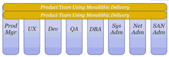 这种整体型架构要求产品队伍横跨产品管理 Dev开发 QA DBA 以及系统经营管理,而微服务架构引入以后,如下图: