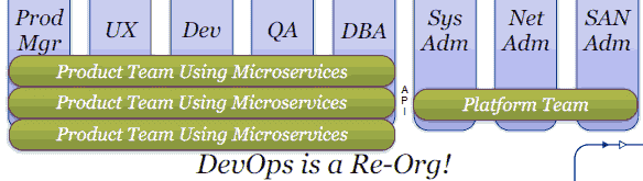 微服务促进了DevOps方式的重组,将一个大臃肿的整体产品开发队伍切分为根据不同微服务的划分的产品队伍,以及一个大的整体的平台队伍负责经营管理,两者之间通过API交互,做到了松耦合隔绝。