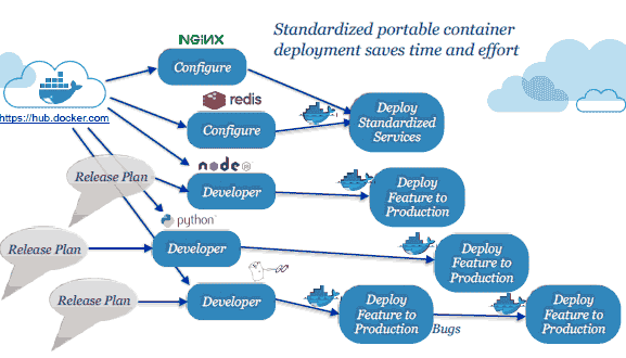 因为Docker引入,不同的微服务可以使用不同的技术架构,比方Node.js Java Ruby Python等等,这些单个的服务都可以独立完成交付生命周期,如下: