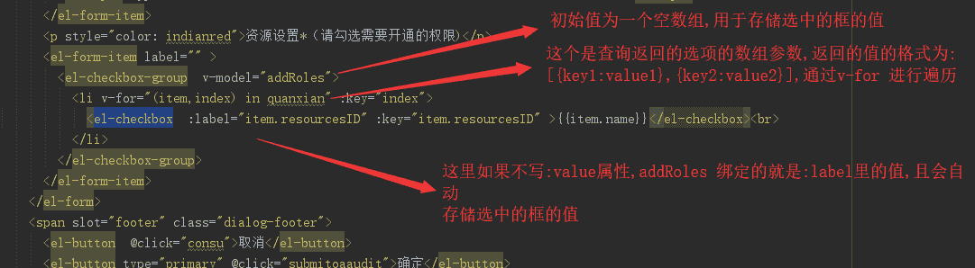 <el-checkbox-group v-model="addRoles"> <li v-for="(item,index) in quanxian" :key="index"> <el-checkbox :label="item.resourcesID" :key="item.resourcesID" >{{item.name}}</el-checkbox><br> </li></el-checkbox-group>