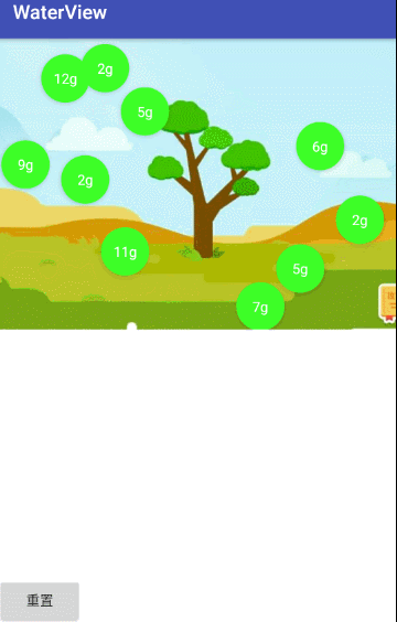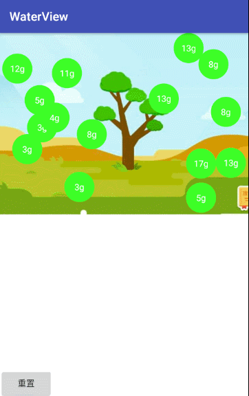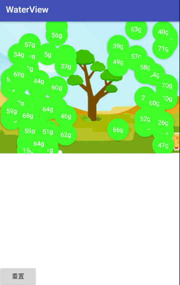 创立view最重要的两件事情: 1、给view一个随机的方向并且保存到view的tag里 //随机设置view动画的方向 view.setTag(R.string.isUp, mRandom.nextBoolean()); 2、随机设置view的位置(我这里并非完全随机,而是给了少量值,而后随机选择这些值)、这里用了一个新的集合保存已经选择到的数,下次选择的时候排除这些值,由于最好水滴不要完全重合嘛。/**但是其实这不是我最终的方法,先往下看吧,还有彩蛋**/ /** * 获取x轴或者是y轴上的随机值 * * @return */ private double getX_YRandom(List<Float> choseRandoms,List<Float> saveRandoms) { float random = 0; while (random == 0 || saveRandoms.contains(random)) { random = choseRandoms.get(mRandom.nextInt(choseRandoms.size())); } saveRandoms.add(random); return random; }