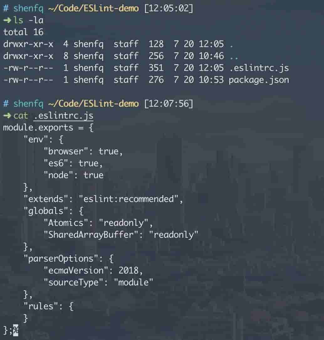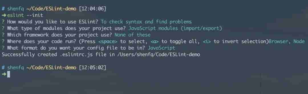 # 全局安装 ESLint$ npm install -g eslint# 进入项目$ cd ~/Code/ESLint-demo# 初始化 package.json$ npm init -f# 初始化 ESLint 配置$ eslint --init