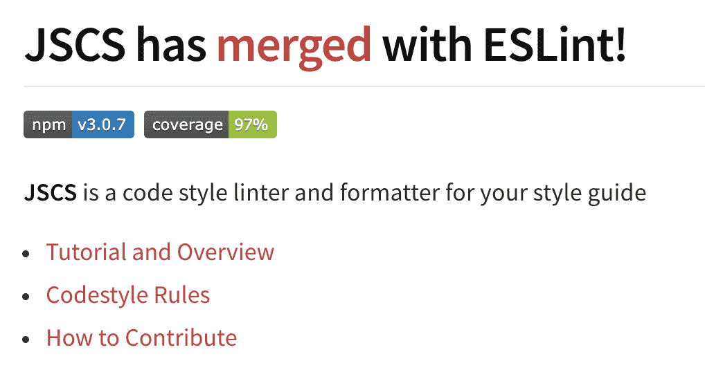 因为 JSLint 让很多人无法忍受它的规则,感觉受到了压迫,所以 Anton Kovalyov (现在在 Medium 工作) 基于 JSLint 开发了 JSHint。JSHint 在 JSLint 的基础上提供了丰富的配置项,给了开发者极大的自由,JSHint 一开始就保持着开源软件的风格,由社区进行驱动,发展十分迅速。早期 jQuery 也是使用 JSHint 进行代码检查的,不过现在已经转移到 ESLint 了。