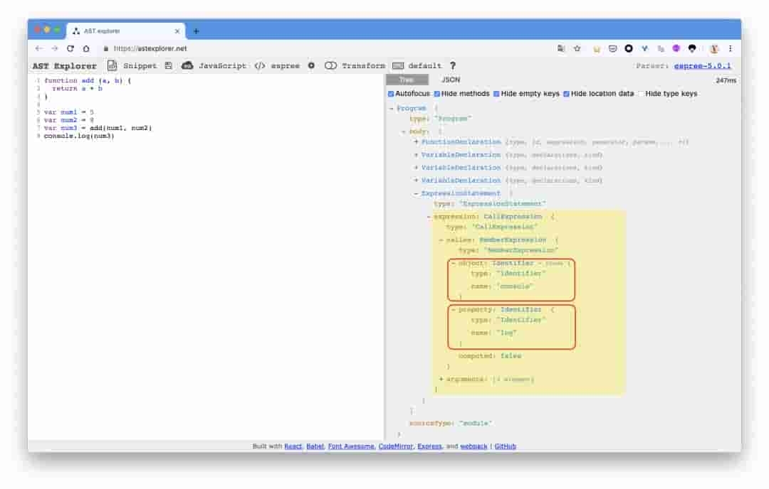 可以看到 console.log() 属于 ExpressionStatement(表达式语句) 中的 CallExpression(调用语句)。