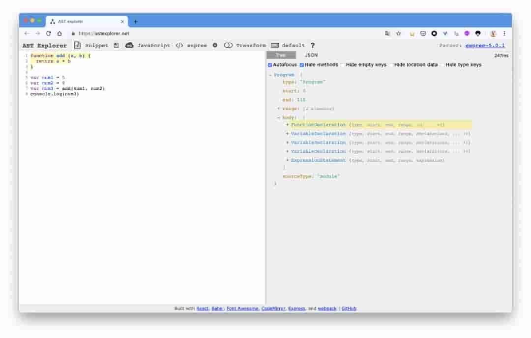 在详细讲解如何创立一个规则之前,我们先来谈谈 AST(笼统语法树)。ESLint 使用了一个叫做 Espree 的 JavaScript 解析器来把 JavaScript 代码解析为一个 AST 。而后深度遍历 AST,每条规则都会对匹配的过程进行监听,每当匹配到一个类型,相应的规则就会进行检查。为了方便查看 AST 的各个节点类型,这里提供一个网站能十分清晰的查看一段代码解析成 AST 之后的样子:astexplorer。假如你想找到所有 AST 节点的类型,可以查看 estree。
