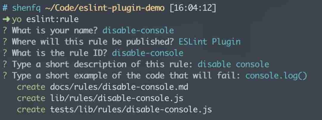 创立好项目之后,即可以开始创立一条规则了,幸运的是 generator-eslint 除了能够生成插件的模板代码外,还具备创立规则的模板代码。打开之前创立的 eslint-plugin-demo 文件夹,在该目录下增加一条规则,我希望这条规则能检测出我的代码里面能否有 console ,所以,我给该规则命名为 disable-console。