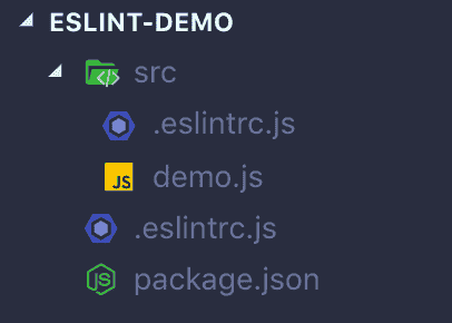 我们有如下目录结构,此时在根目录运行 ESLint,那么我们将得到两个配置文件 .eslintrc.js(项目级配置) 和 src/.eslintrc.js(目录级配置),这两个配置文件会进行合并,但是 src/.eslintrc.js 具备更高的优先级。