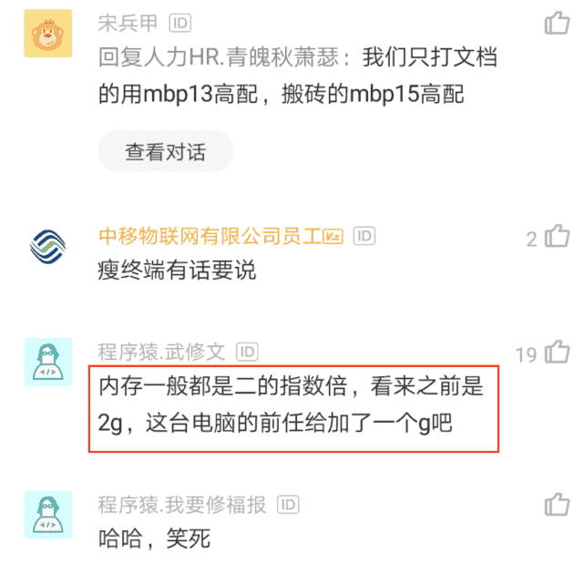 其实我们从程序员的角度来看,公司之所以给自己电脑配置这么低,能反映出2种情况。第一种是公司根本就不重视开发,谁不知道开发是需要一个好的电脑呢?你这个几年前配置的电脑给我用,公司也太抠门了;第二种情况是公司效益不好,都舍不得花钱给员工弄个好电脑。不论哪种情况,真的没有必要重新申请电脑了。那么,网友是怎样说的呢?