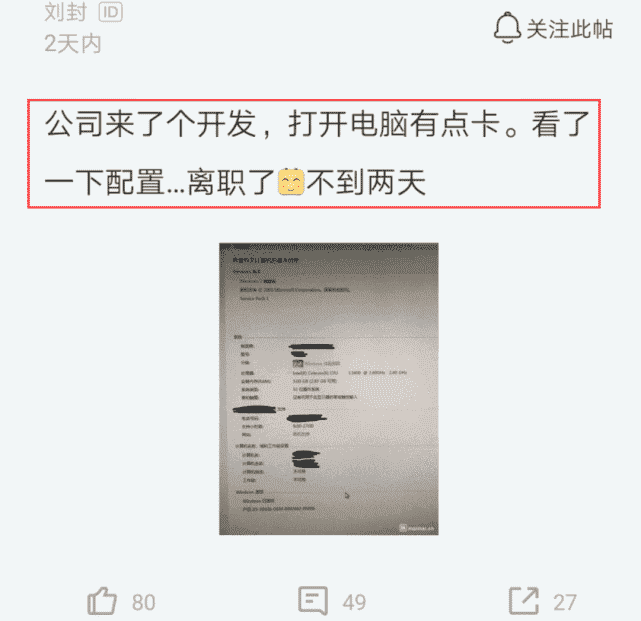 还有网友说假如换做是我,也会辞职啊,根本连一天都不想待在公司。能给出这样电脑的人,要么是根本不理解开发的需求,要么是不重视自己。