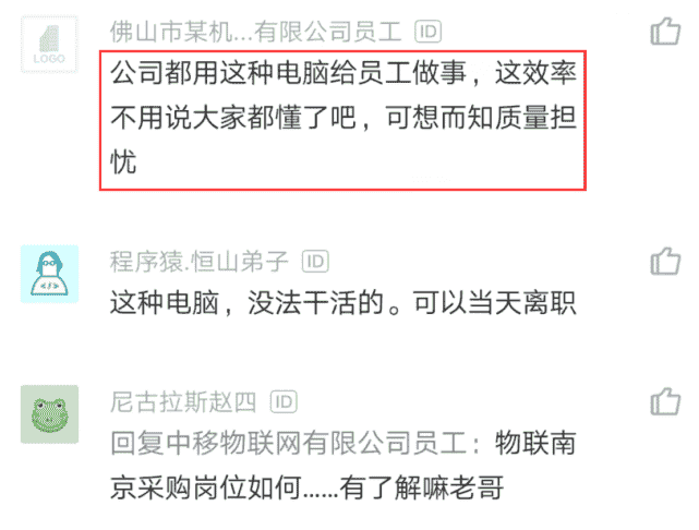 有网友说这个电脑配置只适合办公用,想要用来写代码搞开发,这个也太差了吧。要知道作为一个程序员,假如连个趁手电脑都没有的话,那还真不如辞职。比方说原本一天就能写完的代码,在用了这样的电脑之后,很可能会用几天才能完成。其实这还不是做主要的起因,是由于体验感太差。