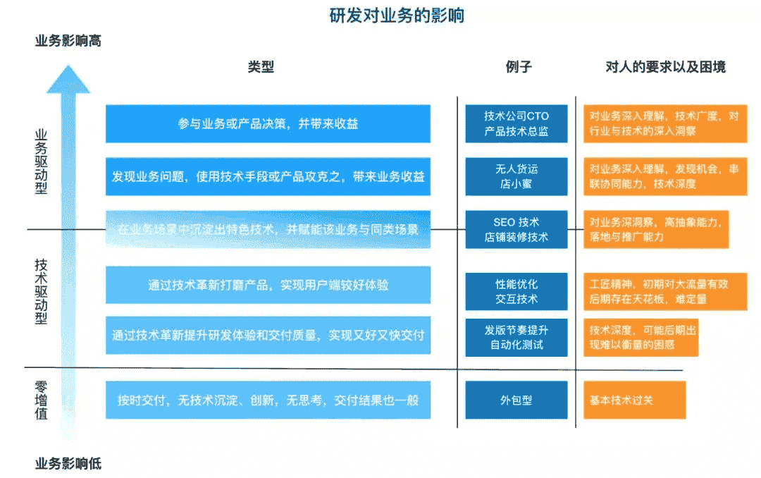 上述几个阶段,层层递进,对业务的影响不断提升,不论是间接还是直接地做效能、体验、质量、稳固,还是做直接促进业务增值的事情,最终都是要促进业务发展的,只是方式不一样,影响程度不一样,作为技术的职责,就是要想办法让业务能够更好,能让技术的价值有更大的表现。
