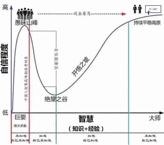 提升架构认知高度,就像达克效应所形容的一样,要敢于从愚昧之巅跳到绝望之谷,通过爬升开悟之坡,从而达到架构认知的巅峰时刻。