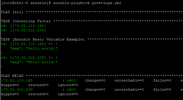 在上述剧本中,greeting变量由值Hello world!代替。当剧本运行时,该剧本仅打印消息Hello world!