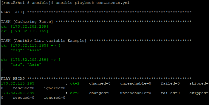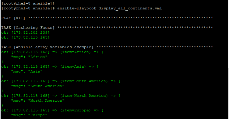 下面的剧本显示了一个名为continents的变量。该变量包含5个不同的值-大洲名称。使用索引0作为第一个变量可以轻松访问这些值中的每一个。