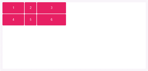 由于定义中只有三列,所以项目4,5,6排在新的一行; 并由于它们位于第1,2,3列的轨道上,所以其宽度等于定义中第1,2,3列轨道的宽度。