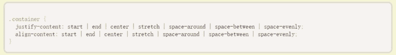 这两个属性的写法完全相同,都可以取下面这些值。(下面的图都以justify-content属性为例,align-content属性的图完全一样,只是将水平方向改成垂直方向。)