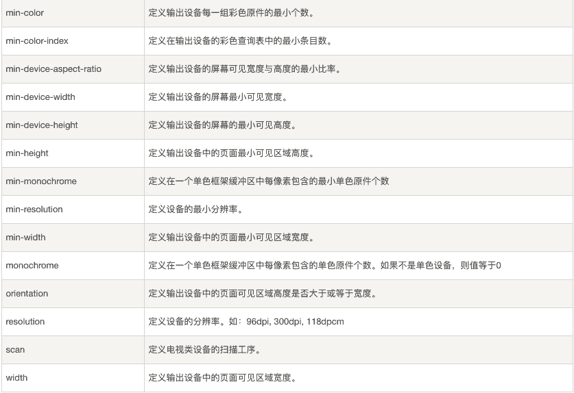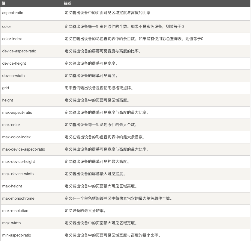 此时,我们就需要填写 @media mediatype and|not|only (media feature) 中的 media feature部分, media feature官方释义为 媒体功能,浅显的说 就是 我们通过获取到设施了。那么具体是能够获取到哪些信息呢?