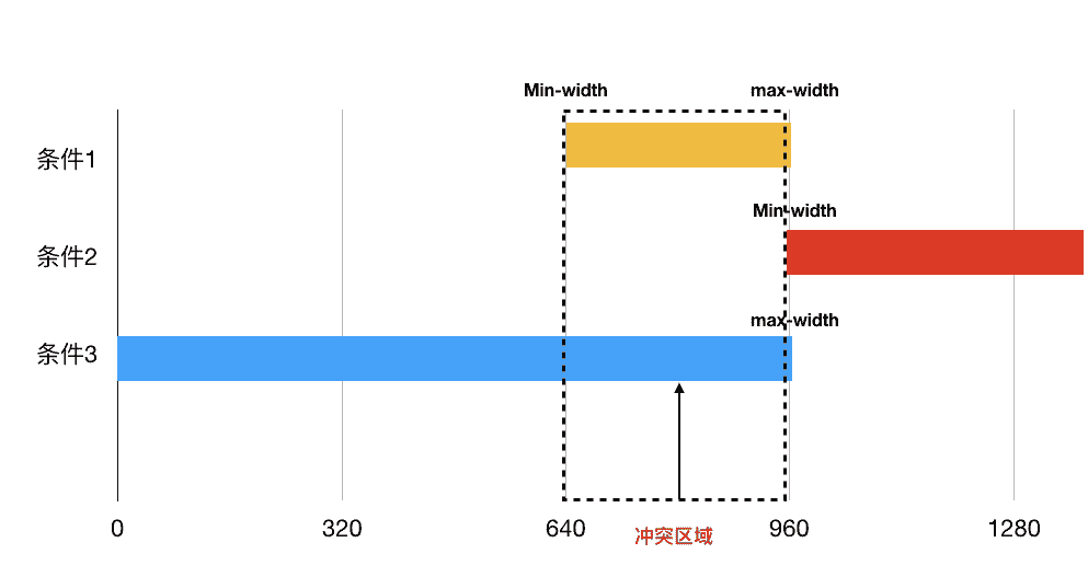 意思就是设施宽度既要大于640px 同时也要小于 960px,使用这种方式需要注意条件要明确,例如: