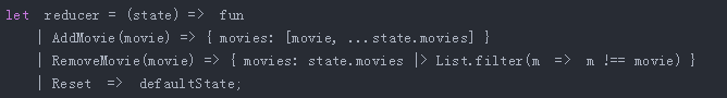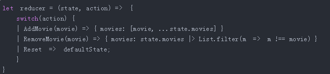 因为匹配参数是 ReasonML 中的常见模式,因而这类函数以较短的格式编写,如前面的代码片段中所示。{ movies: [movie, ...state.movies] }这部分看起来与 TypeScript 中的一样,但是这里发生的事情并不相同!在 ReasonML 中,[1,2,3] 不是数组,而是不可变的列表。可以想象它是在语言本身内置的 Immutable.js。在这一部分中我们利用了一个事实,即 Append 操作在 ReasonML 列表中的时间是恒定的!假如你之前用的是 JavaScript 或者 TypeScript,你可能会随手写下这种代码,无需太多顾虑,并且可以免费取得性能提升。